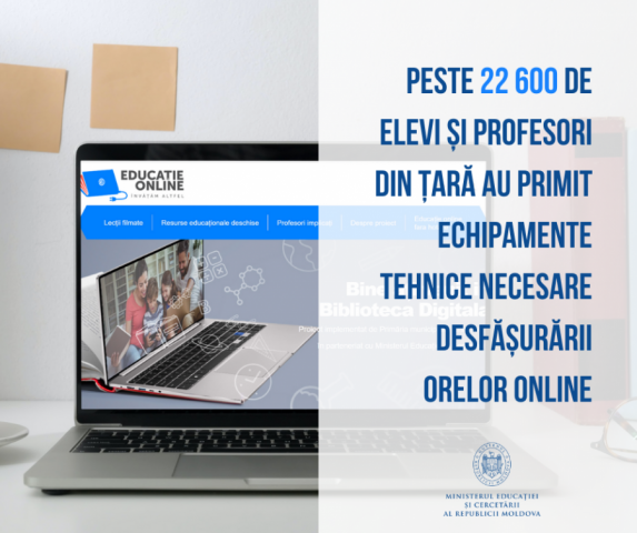În contextul organizării procesului didactic în format online, Ministerul Educației și Cercetării (MEC) sprijină sistemul național de educație, punând la dispoziția elevilor și cadrelor didactice echipamente și dispozitive electronice necesare desfășurării lecțiilor la distanță. Amintim că, pe parcursul anului trecut, MEC a oferit instituțiilor de învățământ peste 16400 de echipamente electronice. Având la dispoziție tehnica oferită de MEC, dar și tehnica procurată de instituții, în perioada 24-28 ianuarie a.c., 22626 de elevi și cadre didactice au primit echipamente electronice pentru a participa la învățământul online, dintre care 9126 de elevi și 13500 de cadre didactice. Numărul copiilor din păturile dezavantajate care au primit echipamente electronice este de 7288.